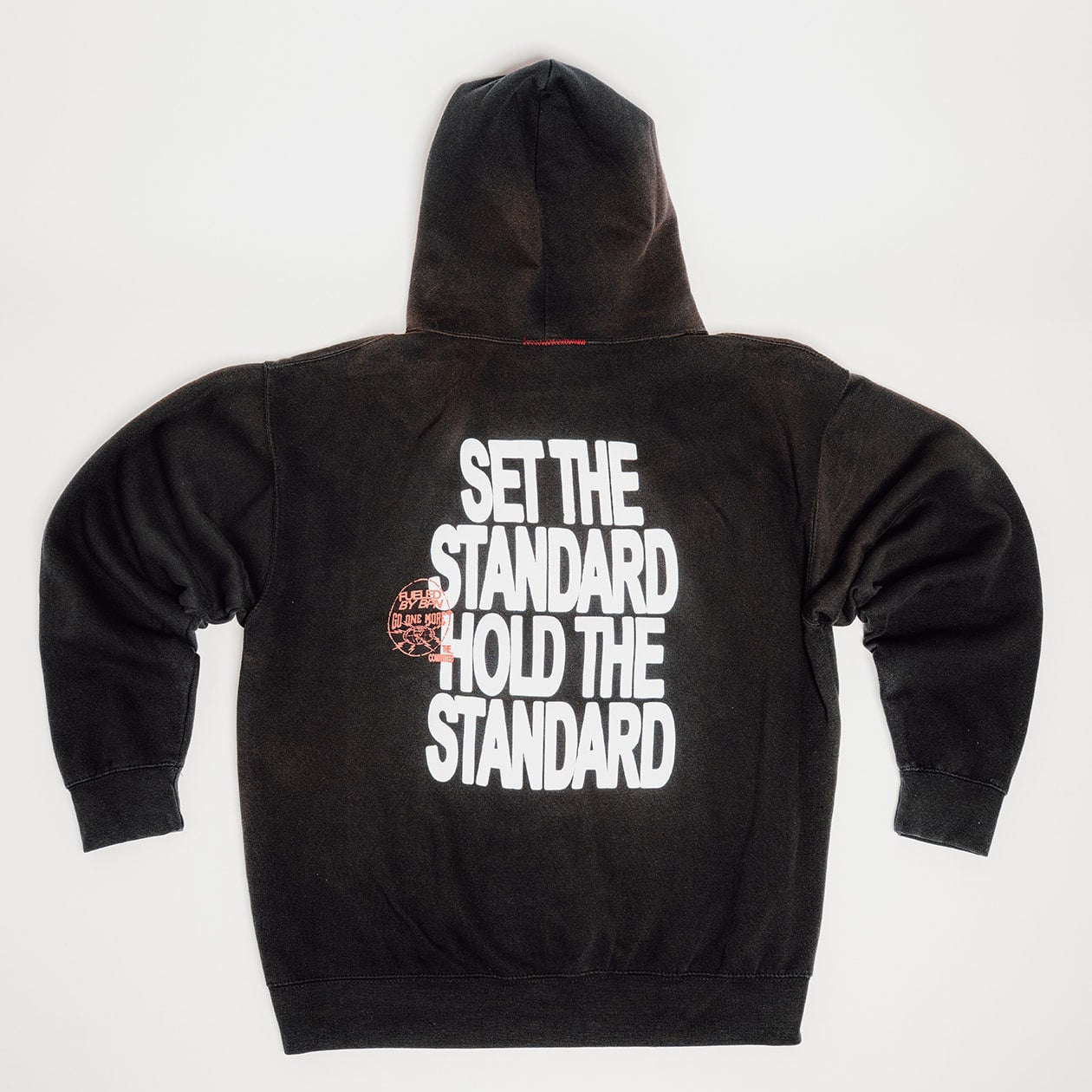 This ultra-soft unisex hoodie blends an athletic look with unmatched comfort. The back features the SET THE STANDARD / HOLD THE STANDARD mantra in bold lettering. Built for warm-ups, rest days, and everything in between. The distressed/washed effect ensures no two are alike.