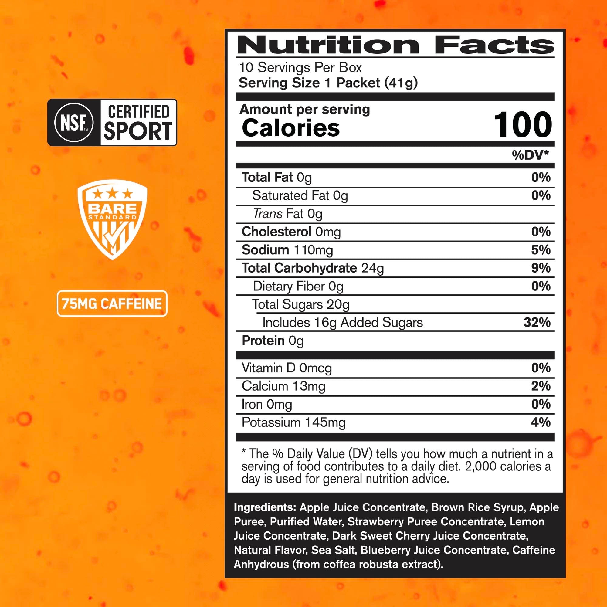 Mixed Berry CAF: Apple Juice Concentrate, Brown Rice Syrup, Apple Puree, Purified Water, Strawberry Puree Concentrate, Lemon Juice Concentrate, Dark Sweet Cherry Juice Concentrate, Natural Flavor, Sea Salt, Blueberry Juice Concentrate, Caffeine Anhydrous (from coffea robusta extract).